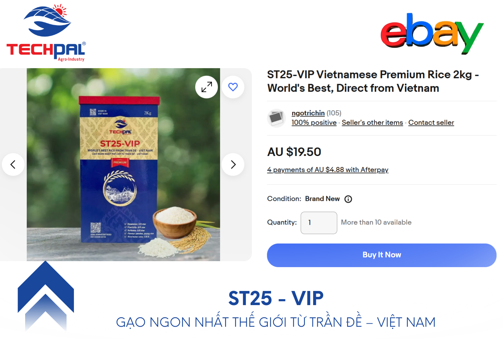 - Tại Mỹ và châu Âu: Gạo Techpal đang được phân phối qua các hệ thống bán hàng của cộng đồng người Việt và châu Á, đồng thời xuất hiện trên các sàn thương mại điện tử như eBay – nơi người tiêu dùng khắp nơi có thể dễ dàng mua được.